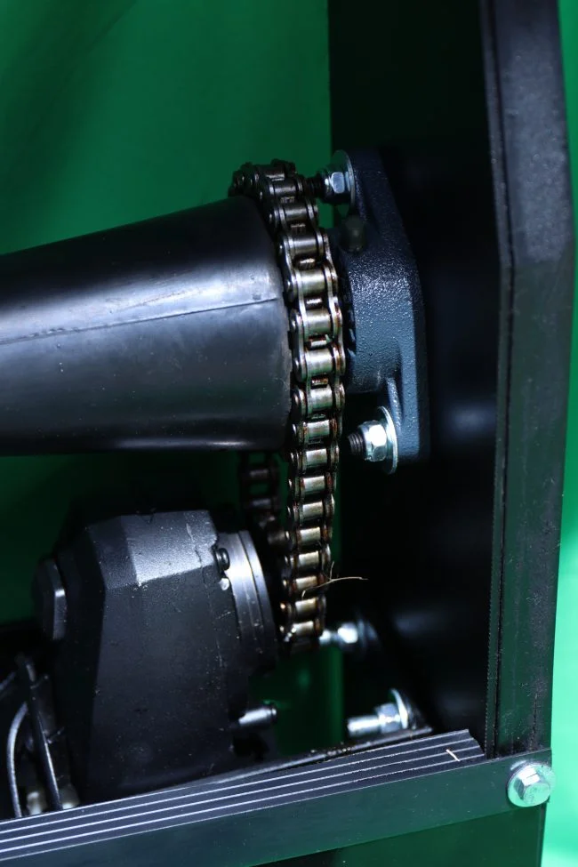 La transmisión del motor a los rodillos se realiza mediante cadena según norma ISO/ANSI, fabricada en acero aleado tratado térmicamente para máxima resistencia a fatiga.